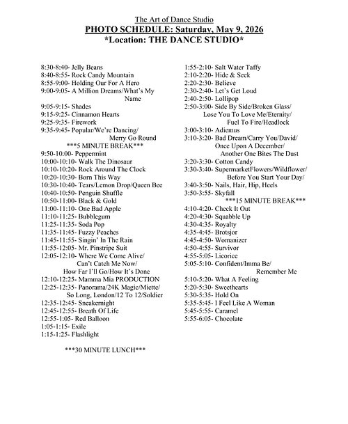 *Photo Day- Saturday, May 9th- @ the studio~ schedule below (Saturday dance classes will be cancelled and rescheduled this day)